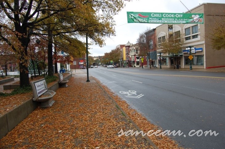 Autumn leaves littered the streets, where a green banner proclaimed a Chili Cook-Off, of which we later partook.
