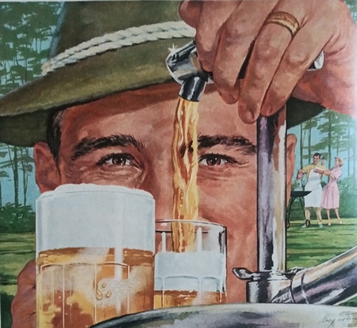 In Douglass Crockwell’s “Winter Evening At Home,” we see that Dad has just finished popping popcorn over the coals of the fire, and Mary has offered a pan of it to be salted by her beau. Everyone is enjoying a chilled glass of ale. What a fun after-dinner treat while they watch Arthur Godfrey. But what’s got Dad so forlorn? Is it because Mary is growing up so fast, and this is her last winter at home before she moves to Michigan to attend university? Is it because his right arm is sore from holding the pan off the ground, and he doesn’t have the energy to pour it into the bowl? He ought to be proud, since he clearly didn’t burn even one kernel. Quite a feat, Dad! Maybe he’s rethinking that low profile carpet and wishing they’d gone with a plush.