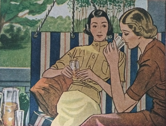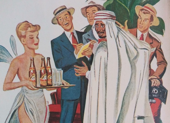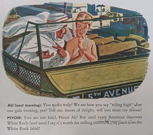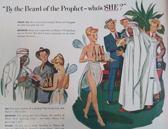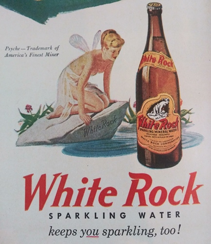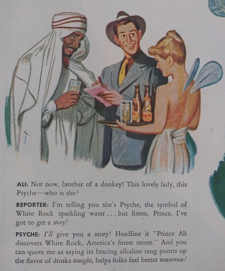 Okay, let’s unpack this post-war ad for White Rock. We’ve got a trio of businessmen in straw boater hats and a Middle Eastern prince whose head has turned toward the topless fairy/cocktail waitress. Remember, somebody had to pitch this idea to White Rock, and White Rock said, “Absolutely, it’s a go.”