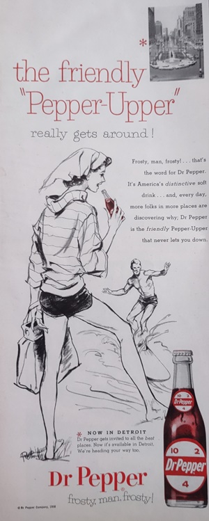 Now in Detroit! I’m not sure why this ad was targeted specifically at Detroit, giving its citizens (comprised of avid surfers along the Detroit coastline) access to the friendly Pepper-Upper. “Frosty, man, frosty” seems consistent with the beatnik counterculture depicted in the Dobie Gillis show that would air the following year. But isn’t the temperature of the drink dependent on its storage, and not its ingredients? Couldn’t any drink be frosty, man?