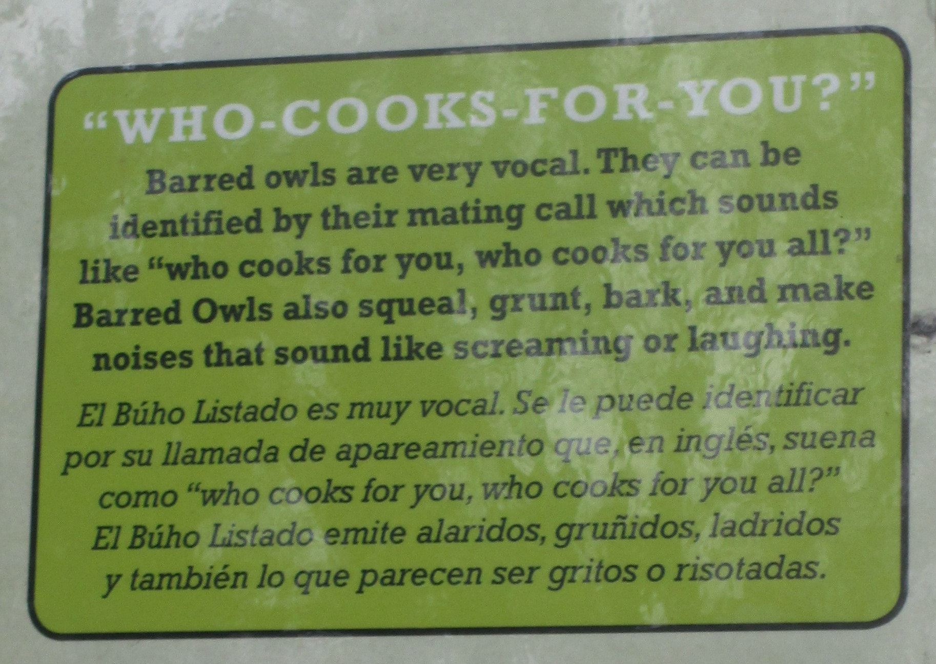 The Barred Owl is also known as the Hoot Owl and the Eight Hooter and the Rain Owl and the Wood Owl and the Striped Owl. Oh, my goodness, I think that’s all the adjectives and nouns that exist. We saw this sign at the Nature & Science Center and cracked up at the mating call of the barred owls:
