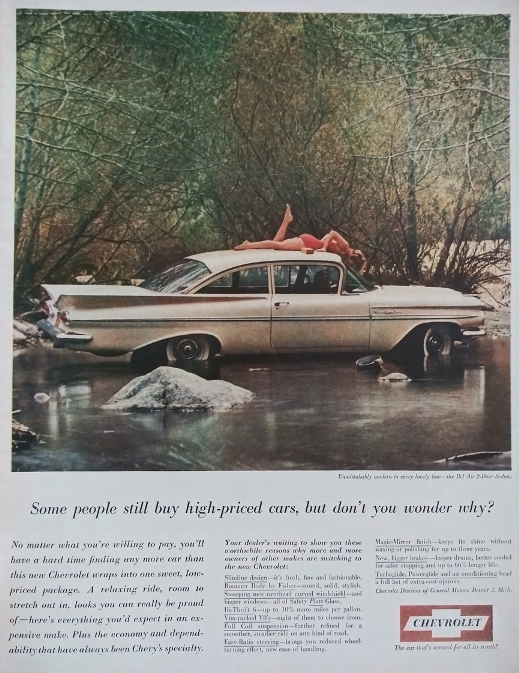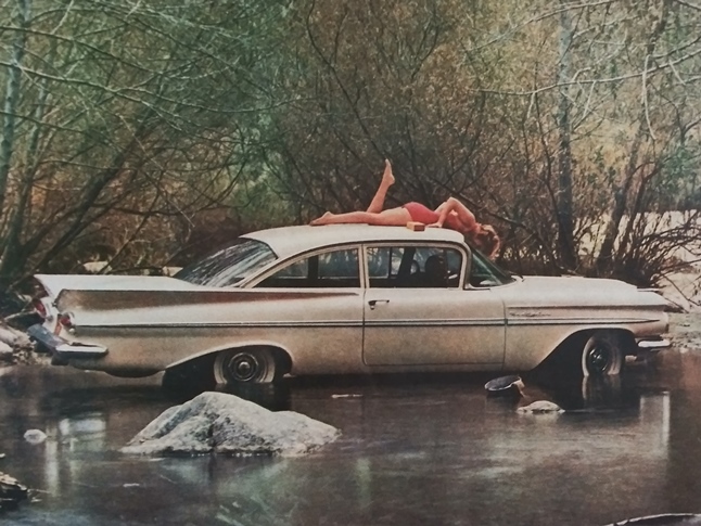 I guess I don’t get the artistic vision of this ad. To me, I see a car unable to simply cross a shallow stream, a driver who has abandoned his vehicle, and a half-naked woman pressed against the windshield, foot whimsically in the air, brick at her side.