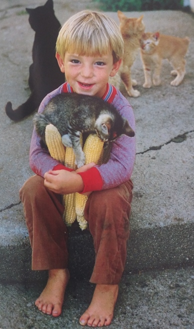 Four-year-old Trent Petersen enjoys three parts corn to one part cat at his family’s farm in Exira, Iowa.