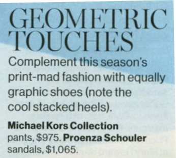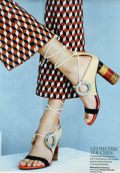 The advertisers may try to bring your eye to their “geometric touches,” but those zigzag white sandal straps put me in mind of the sour cream flourishes on a Chuy’s Tex-Mex platter.