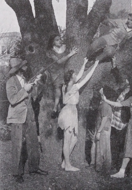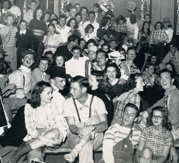 It’s a pretty common occurrence to find pictures like this of Sadie Hawkins Dances in my 1940s-1950s yearbooks. Tattered clothing, corn cob pipes, and overalls with only one arm on the shoulder were de rigueur. Guests often posed on haystacks such as those above.