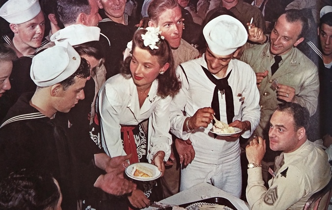 Hair adorned with flower, a hostess at New York’s Stage Door Canteen offers birthday cake to servicemen.