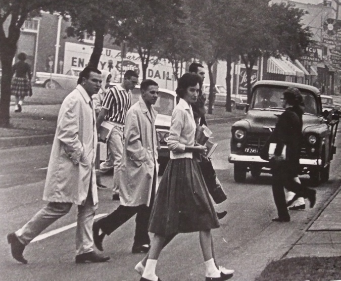 This next image shows nurses and patients at Houston’s St. Elizabeth’s Hospital in the Fifth Ward in March of 1959. Nobody likes to be barefoot, donning a hospital gown, but some encouragement, attention, and a fire truck can go a long way toward healing.