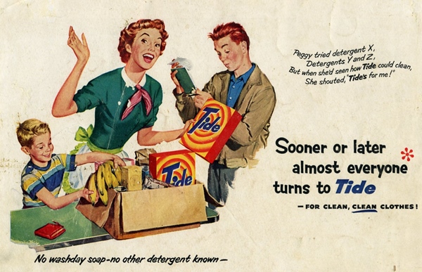 In Douglass Crockwell’s “Winter Evening At Home,” we see that Dad has just finished popping popcorn over the coals of the fire, and Mary has offered a pan of it to be salted by her beau. Everyone is enjoying a chilled glass of ale. What a fun after-dinner treat while they watch Arthur Godfrey. But what’s got Dad so forlorn? Is it because Mary is growing up so fast, and this is her last winter at home before she moves to Michigan to attend university? Is it because his right arm is sore from holding the pan off the ground, and he doesn’t have the energy to pour it into the bowl? He ought to be proud, since he clearly didn’t burn even one kernel. Quite a feat, Dad! Maybe he’s rethinking that low profile carpet and wishing they’d gone with a plush.
