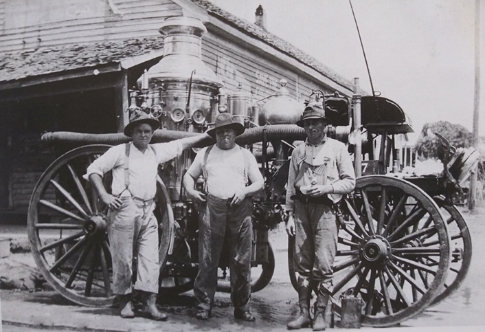 It’s 1920 in Houston, Texas. These firefighters from Station No. 7 stand in front of their sweet steam truck with the big A wheels. Mike Lathrop is to the left, in suspenders, Magerson Smith (Magerson is a cool name, no?) is in overalls to the right, and a man known only as Poop is in the middle. I’m guessing this was before hot firefighter calendars were popular.