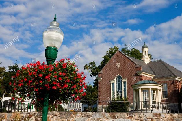 This picture of the Camden, Maine public library was taken exactly 40 years later, lamppost gardens still in bloom.