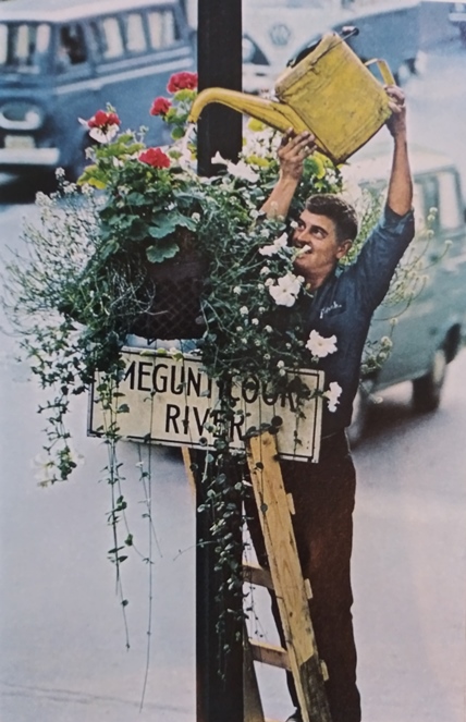 Charles Sturdee tends to the lamppost garden blooms on Camden, Maine’s main street. A blacksmith made the wire basket, and the Camden Garden Club provided the geraniums, petunias, and vines, adding to the beauty of the town.