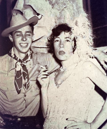 The posture and expression of this 1949 flapper throwback suggest she knows more secrets of the night than her cowboy companion. Sassy with those plumes in her hair!