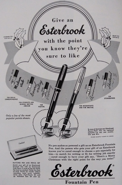 If cameras weren’t your bag, you could gift a pen. Folks used to use pens a lot. For writing letters. And doing accounting stuff. And writing out checks. Now we just use them to sign forms. But Esterbrook gave you all kinds of tip options. Fun!