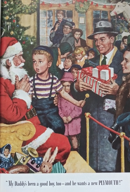 Before we lived in a culture where some believed that asking your child to sit in Santa’s lap was a violation of personal rights, kids would line up at department stores to sit in the lap of jolly old Saint Nick and tell him what they wanted for Christmas, without having parents looming within earshot. The little boy in this Plymouth ad definitely has his dad’s back.
