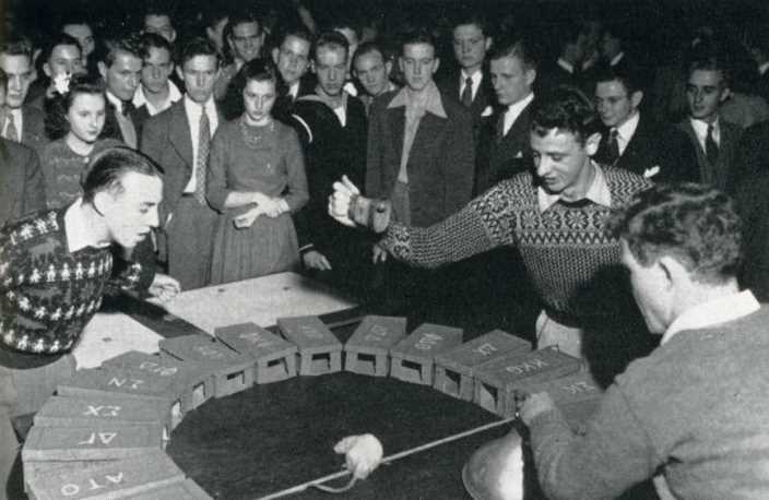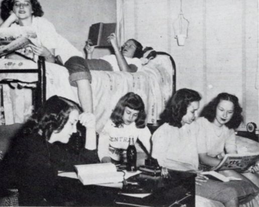These Jayhawk college students have just taken a hayride out to the country to enjoy a campfire and REEEEEEEACH for some flame-grilled wieners during the autumn of 1946.