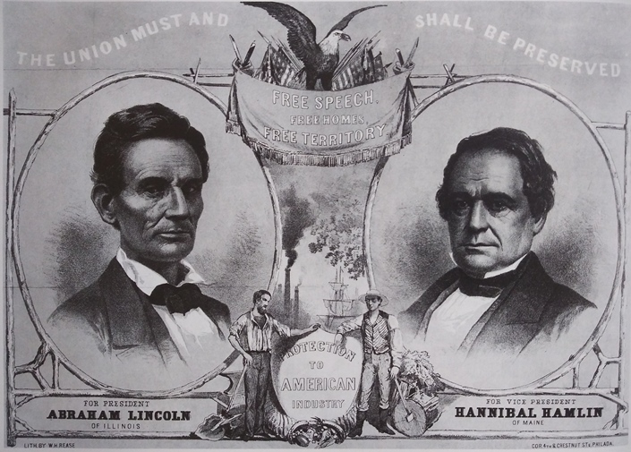 My minor was in history, and I admit I’ve never heard of Hannibal Hamlin, the first Republican Vice President. Or perhaps the memory of him was replaced by the cannibal Hannibal in the movie I saw my freshman year, forever cursing the name. I can promise you no one in public school will ever learn his name. But how could we be expected to know the names of the Vice Presidents? We don’t even know what they do. Neither he nor Lincoln look particularly psyched for union preservation in this poster. A former member of both the House of Representatives and the Senate, Hamlin left the pro-slavery Democratic Party in 1856 for the newly-formed Republican Party that aligned with his anti-slavery views. He served only four years, during all but the very last month of the Civil War, and was replaced during the 1864 election by Andrew Johnson. Among other positions that followed, Hamlin returned to the Senate and served two terms, then became the US Ambassador to Spain. Que bueno!