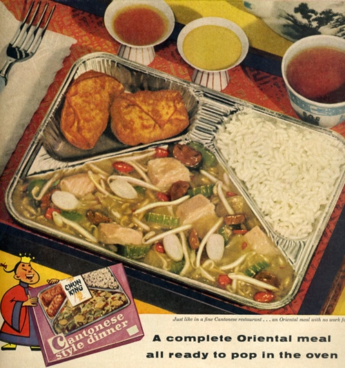 This frozen dinner must have been pretty exotic in ’58, but it looks pretty ew on my end. One wonders how well it held up to the reheating process. And trying to mix the rice with the chicken would inevitably create a mess all over the placemat.