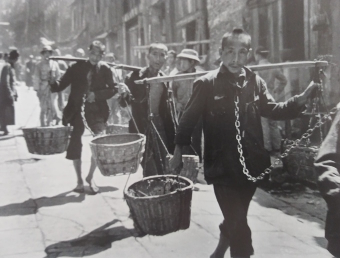 Below, conscripts of the Chinese Nationalist Army walk through the city on labor detail. Makes social distancing seem like a walk in the park.