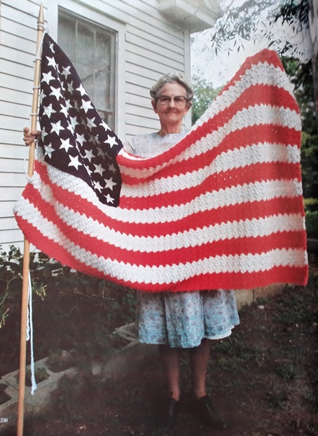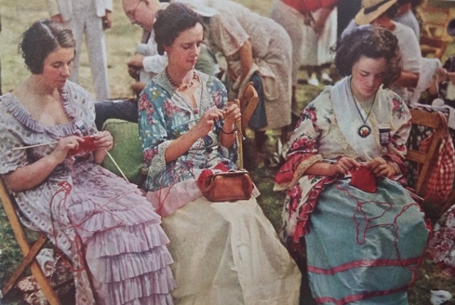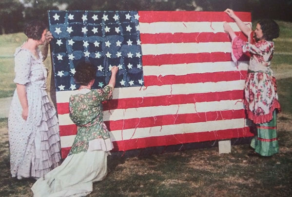 Welcome to an “old-fashioned wool-working exhibit” on the Common in Boston, where these contestants competed to win the knitting trophy. Originating in 1634, it is the oldest city park in the United States. The squares of 200 women (and the one lone fellow shown above) were pinned on a board to form the Stars and Stripes. In just one day, they created this woolen flag.