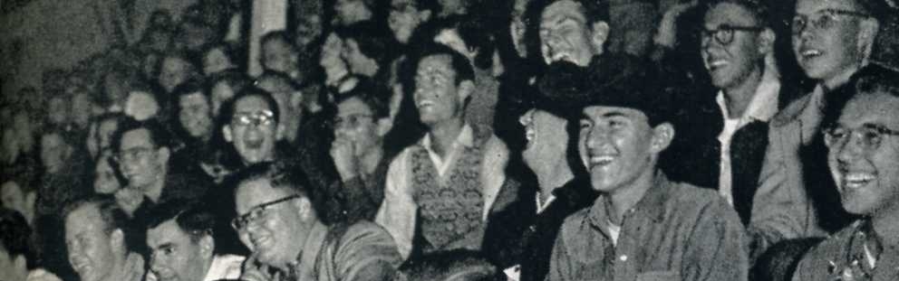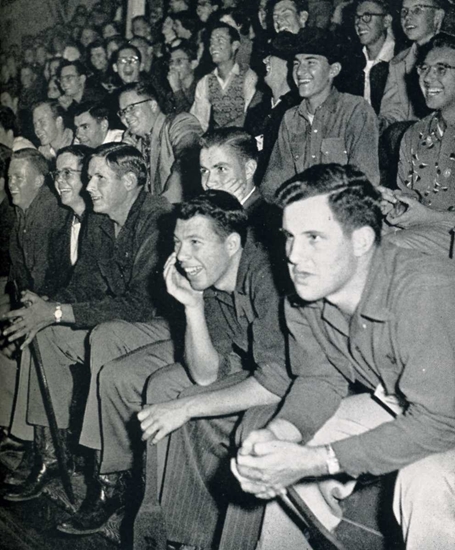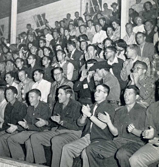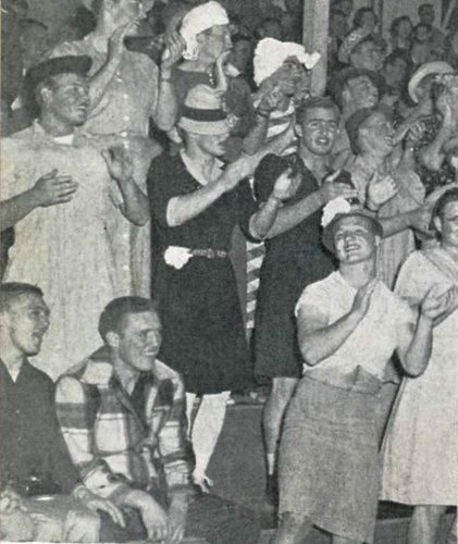 The whole first row is clapping. No one is too cool for school. I just like to zoom in on these people and wonder what they were thinking. Were they whooping, hollering, or doing an Indian war cry? I love the shirt print, the jackets, the glasses, the cowboy hat, the hair.