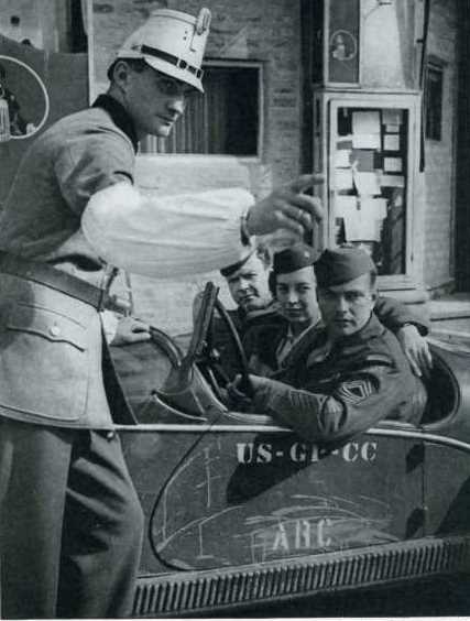 An American Red Cross worker is snugly sandwiched between two soldiers in a requisitioned vehicle, as a Berlin traffic policeman directs them during a sightseeing tour.