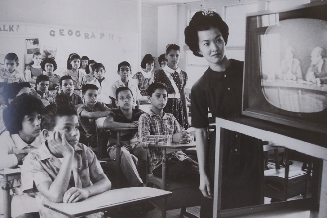 Svelte Rusk Elementary teacher Myrna Chun-Hoon wheels in the cattywampus TV cart, so students can learn the details of Walter Schirra’s orbital flight during the Mercury-Atlas 8 mission.