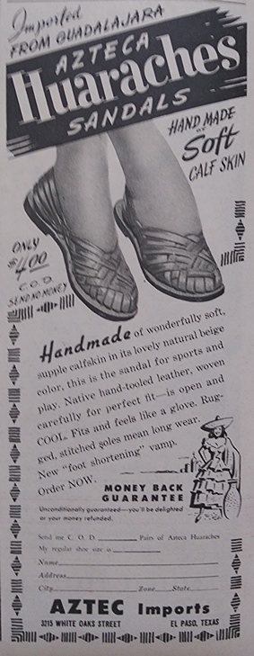 Finally, something I’ve heard of. Huarache sandals, too …. A bushy, bushy blond hairdo … Surfin’ USA. ♫♪♫ Calf skin? I’m familiar with it. I get it. Wait, they come with foot shortening vamp? What the heck is that?