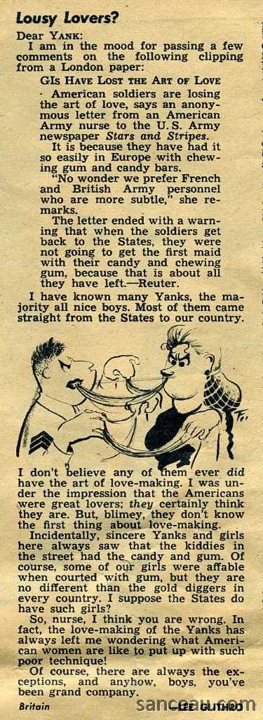 Here a British soldier conveys the perception of American soldiers as lousy lovers: