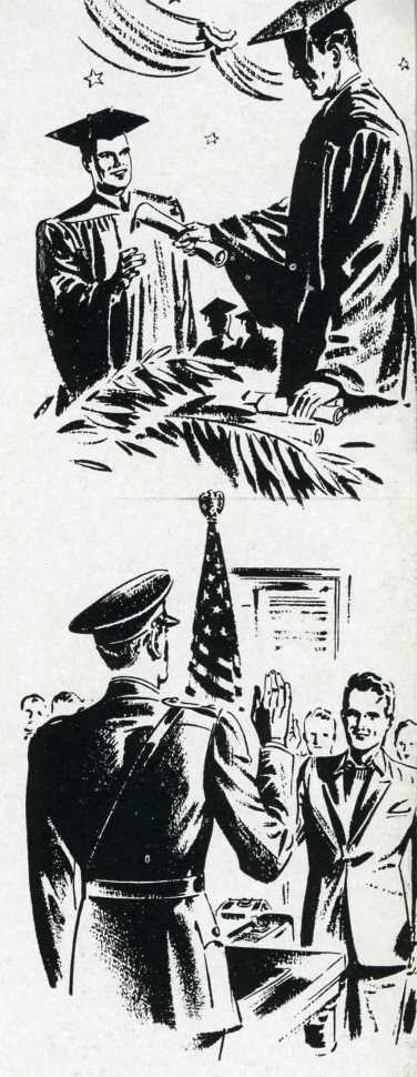In 1943, the USA was smack dab in the middle of WWII, and graduating college students were faced with the inevitable: enlistment. A cartoon in the Jayhawker magazine shows the four steps awaiting them: graduation and swearing in…