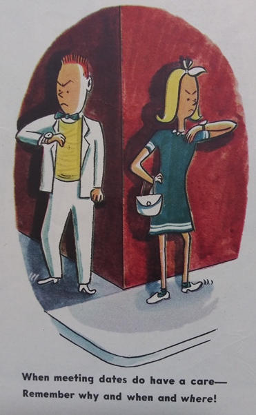 If this was geared toward 1940s teens, I’m not sure of the implications. Surely not the walk of shame. Couldn’t she simply have knocked on the door and had her parents open it? I don’t get it.