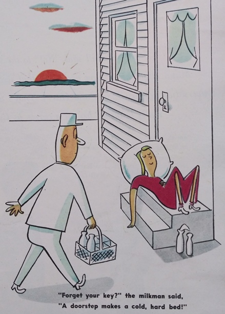 Lastly, we see a milkman at sunrise, stumbling upon a woman who has forgotten her key, but somehow managed to locate a fluffy pillow.