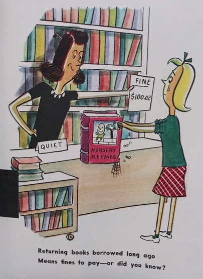 My April 1947 Seventeen magazine includes some cute rhymes to help teens be better human beings. The threat of a $100.02 fine (or $1,212 today, adjusted for inflation) should prove effective. I’ve never paid a library fine, nor a Blockbuster fee, as I try to live my life by the rules. But I can’t imagine anyone accruing over a thousand dollars in library fees, no?
