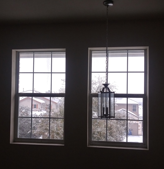 We have several unreachable windows 20 feet high, which is great until a historic, unprecedented event that makes you wish for blinds and curtains to block the sub-zero winds and cold. Note the blue garbage bin, which has been out for 7 days now, waiting for garbage men to empty them. Who knows when that will happen? Our trash cans are full.
