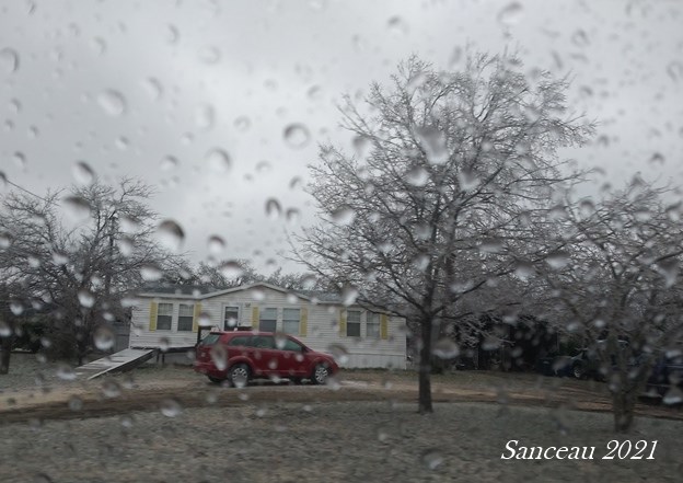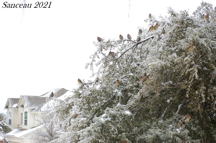 Bird dynamics have been FUBAR during this frozen apocalypse. They appear to be much more sociable than in days of yore, flocking together and flying from icicle tree to icicle tree, wondering what in the name of the holy mother is going on. I know they are cedar waxwings because their little wingtips appear to have been dipped in red and yellow paint, and they wear that black mask which conveys a sense of outrage at Nature’s recent shenanigans. Here in central Texas, the old quote of “water, water everywhere and not a drop to drink” keeps popping up, as we continue yet more days sans water. Yup, it’s snowing, but we can’t drink that, although we’ve melted 14 gallons of it so far to use to flush toilets. Last week, we filled up some Arizona tea jugs with tap water, so we still have that. I suppose the birds can lick the icicles?