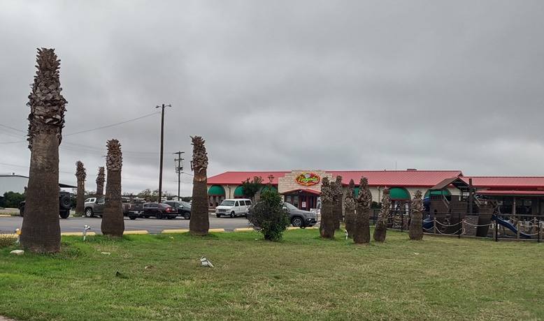 Yesterday, however, we visited Margarita’s restaurant for the first time in years. It used to be visible from the road by its couple dozen large palm trees, swaying in the breeze. It was a lovely tropical vibe. Yesterday, we could barely see it from the road. Then we realized it, too, had suffered palm tree loss.