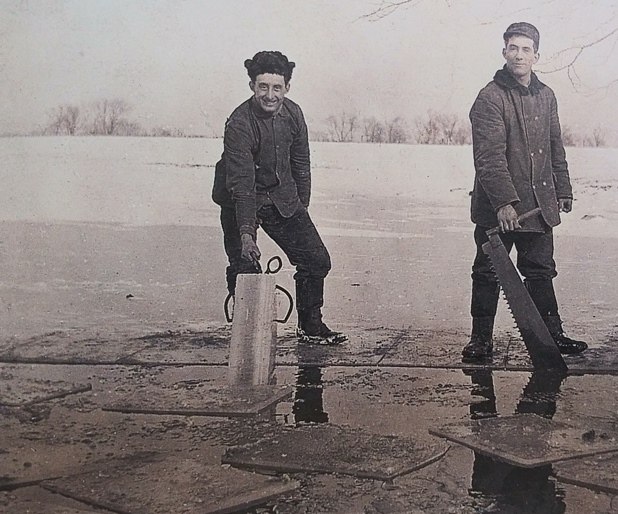 Brothers Fred and Amos Vieira cut ice on their farm pond in Jacksonville, Illinois exactly 100 years ago in 1921. One hopes they never fell through the ice in those heavy jackets, but I imagine, as they were the only two of six sons assigned to this chore, that their competence was high. Ice was stored in sawdust (yes, that’s a thing) for later use. Can you imagine dusty ice cubes in your cocktail? I can’t even imagine a frozen river.