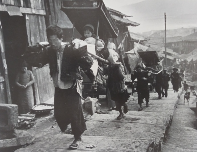 Chair carriers support travelers and their goods as they painstakingly make their way up the steep steps from the Kialing River in Chungking, 1941. And they didn’t even have Asics with good arch support. The provisional capital of China, not under Japanese occupation, would suffer from continuous terror bombing by the Japanese air force until 1943.